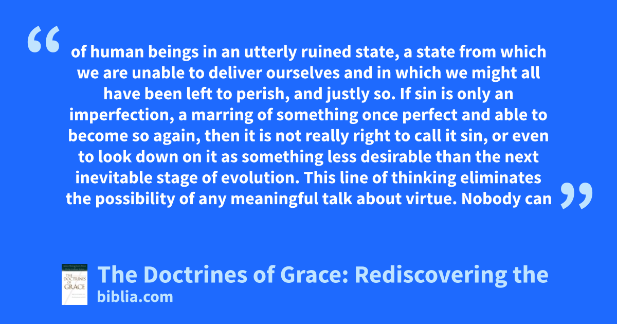 of human beings in an utterly ruined state, a state from which we are unable to deliver ourselves and in which we might all have been left to perish, and justly so. If sin is only an imperfection, a marring of something once perfect and able to become so again, then it is not really right to call it sin, or even to look down on it as something less desirable than the next inevitable stage of evolution. This line of thinking eliminates the possibility of any meaningful talk about virtue. Nobody can