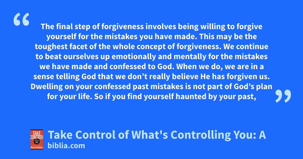 The final step of forgiveness involves being willing to forgive yourself for the mistakes you have made. This may be the toughest facet of the whole concept of forgiveness. We continue to beat ourselves up emotionally and mentally for the mistakes we have made and confessed to God. When we do, we are in a sense telling God that we don’t really believe He has forgiven us. Dwelling on your confessed past mistakes is not part of God’s plan for your life. So if you find yourself haunted by your past,