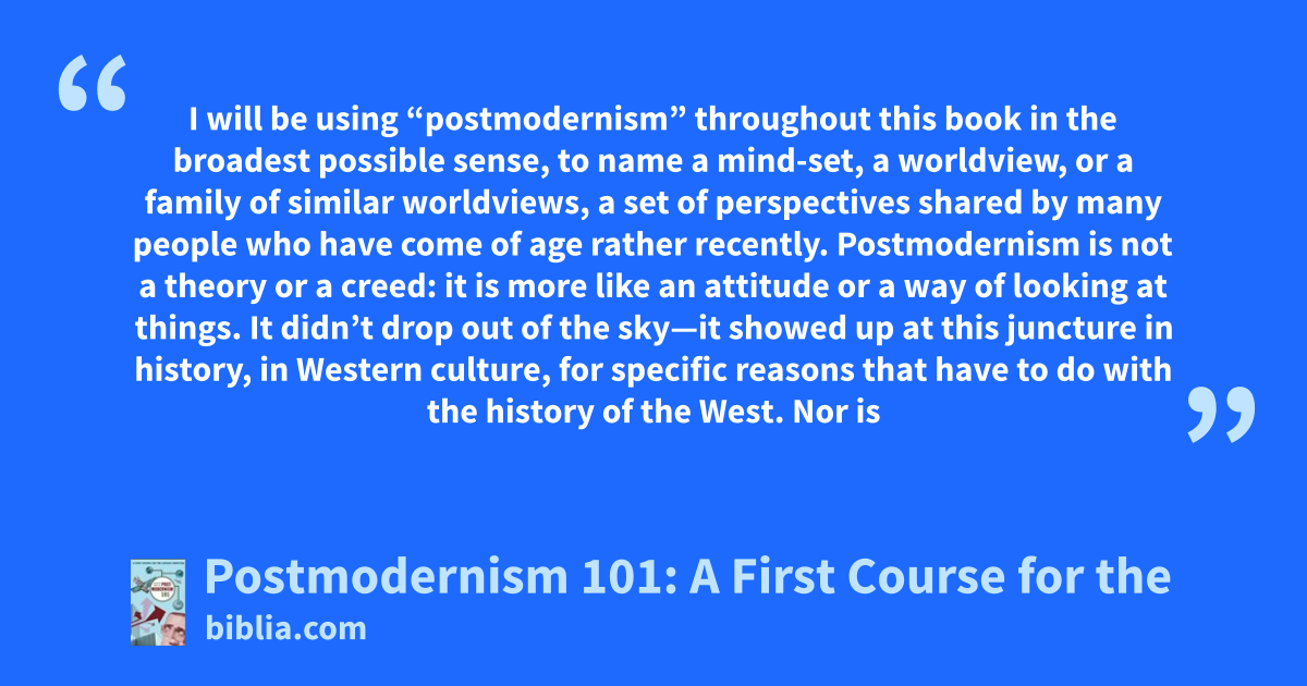 I will be using “postmodernism” throughout this book in the broadest possible sense, to name a mind-set, a worldview, or a family of similar worldviews, a set of perspectives shared by many people who have come of age rather recently. Postmodernism is not a theory or a creed: it is more like an attitude or a way of looking at things. It didn’t drop out of the sky—it showed up at this juncture in history, in Western culture, for specific reasons that have to do with the history of the West. Nor is