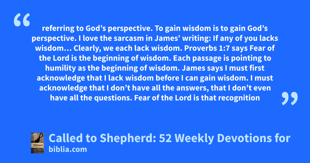 referring to God’s perspective. To gain wisdom is to gain God’s perspective. I love the sarcasm in James’ writing: If any of you lacks wisdom… Clearly, we each lack wisdom. Proverbs 1:7 says Fear of the Lord is the beginning of wisdom. Each passage is pointing to humility as the beginning of wisdom. James says I must first acknowledge that I lack wisdom before I can gain wisdom. I must acknowledge that I don’t have all the answers, that I don’t even have all the questions. Fear of the Lord is that recognition