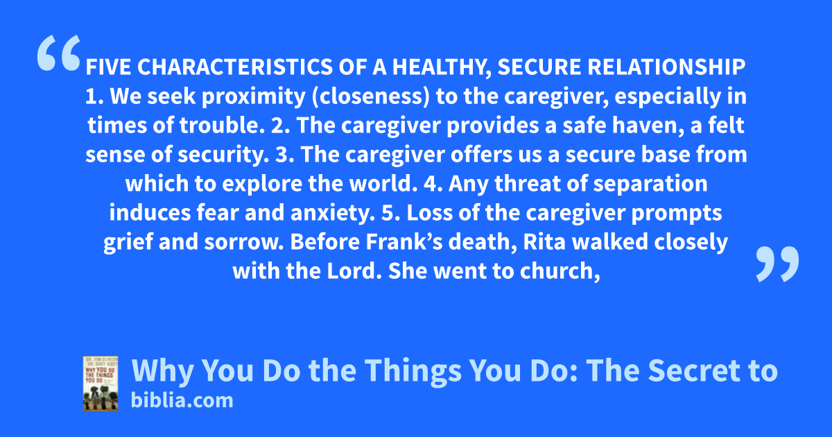 FIVE CHARACTERISTICS OF A HEALTHY, SECURE RELATIONSHIP 1. We seek proximity (closeness) to the caregiver, especially in times of trouble. 2. The caregiver provides a safe haven, a felt sense of security. 3. The caregiver offers us a secure base from which to explore the world. 4. Any threat of separation induces fear and anxiety. 5. Loss of the caregiver prompts grief and sorrow. Before Frank’s death, Rita walked closely with the Lord. She went to church,