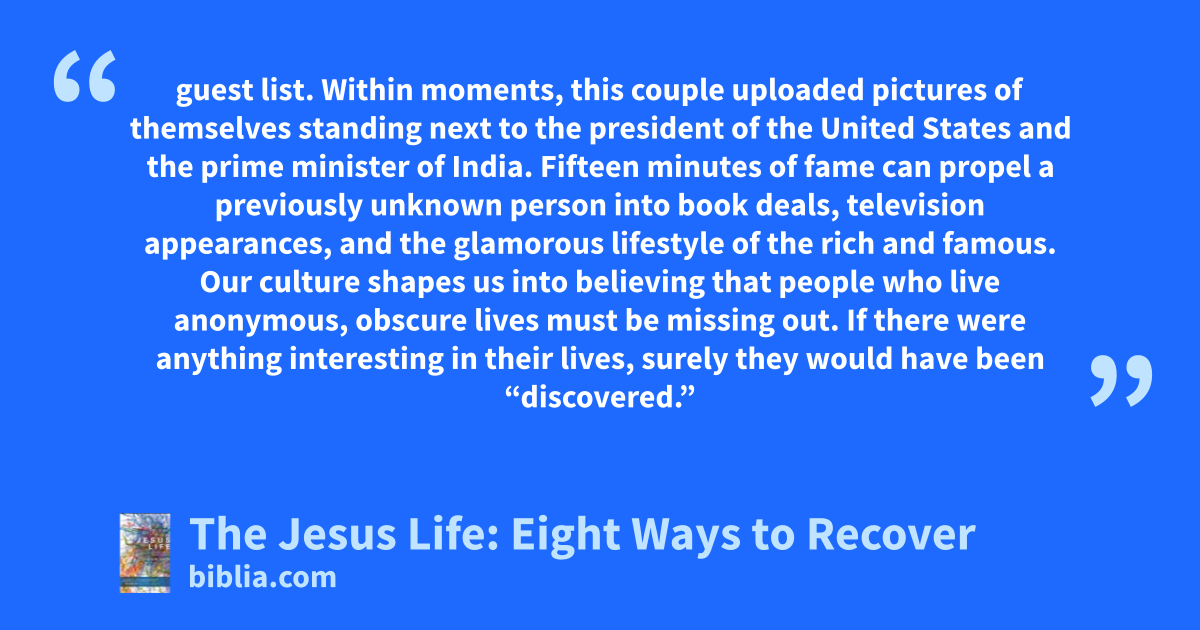 guest list. Within moments, this couple uploaded pictures of themselves standing next to the president of the United States and the prime minister of India. Fifteen minutes of fame can propel a previously unknown person into book deals, television appearances, and the glamorous lifestyle of the rich and famous. Our culture shapes us into believing that people who live anonymous, obscure lives must be missing out. If there were anything interesting in their lives, surely they would have been “discovered.”