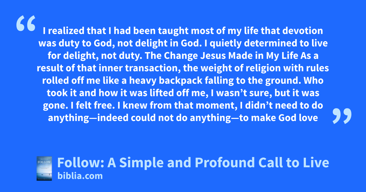 I realized that I had been taught most of my life that devotion was duty to God, not delight in God. I quietly determined to live for delight, not duty. The Change Jesus Made in My Life As a result of that inner transaction, the weight of religion with rules rolled off me like a heavy backpack falling to the ground. Who took it and how it was lifted off me, I wasn’t sure, but it was gone. I felt free. I knew from that moment, I didn’t need to do anything—indeed could not do anything—to make God love