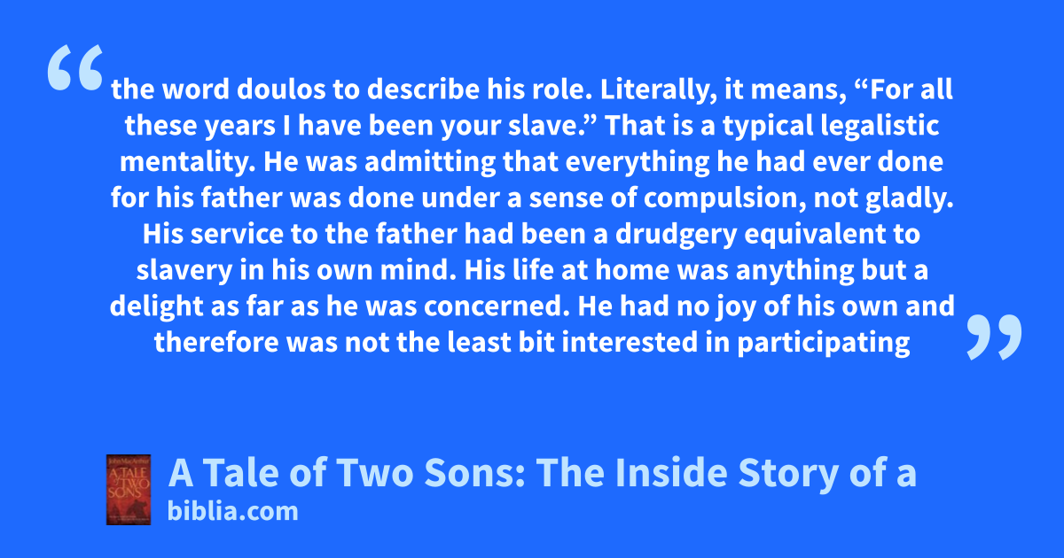 the word doulos to describe his role. Literally, it means, “For all these years I have been your slave.” That is a typical legalistic mentality. He was admitting that everything he had ever done for his father was done under a sense of compulsion, not gladly. His service to the father had been a drudgery equivalent to slavery in his own mind. His life at home was anything but a delight as far as he was concerned. He had no joy of his own and therefore was not the least bit interested in participating