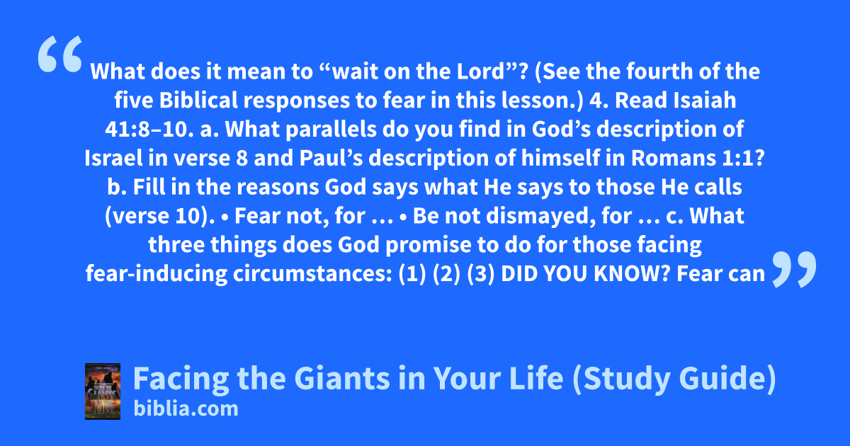 What does it mean to “wait on the Lord”? (See the fourth of the five Biblical responses to fear in this lesson.) 4. Read Isaiah 41:8–10. a. What parallels do you find in God’s description of Israel in verse 8 and Paul’s description of himself in Romans 1:1? b. Fill in the reasons God says what He says to those He calls (verse 10). • Fear not, for … • Be not dismayed, for … c. What three things does God promise to do for those facing fear-inducing circumstances: (1) (2) (3) DID YOU KNOW? Fear can