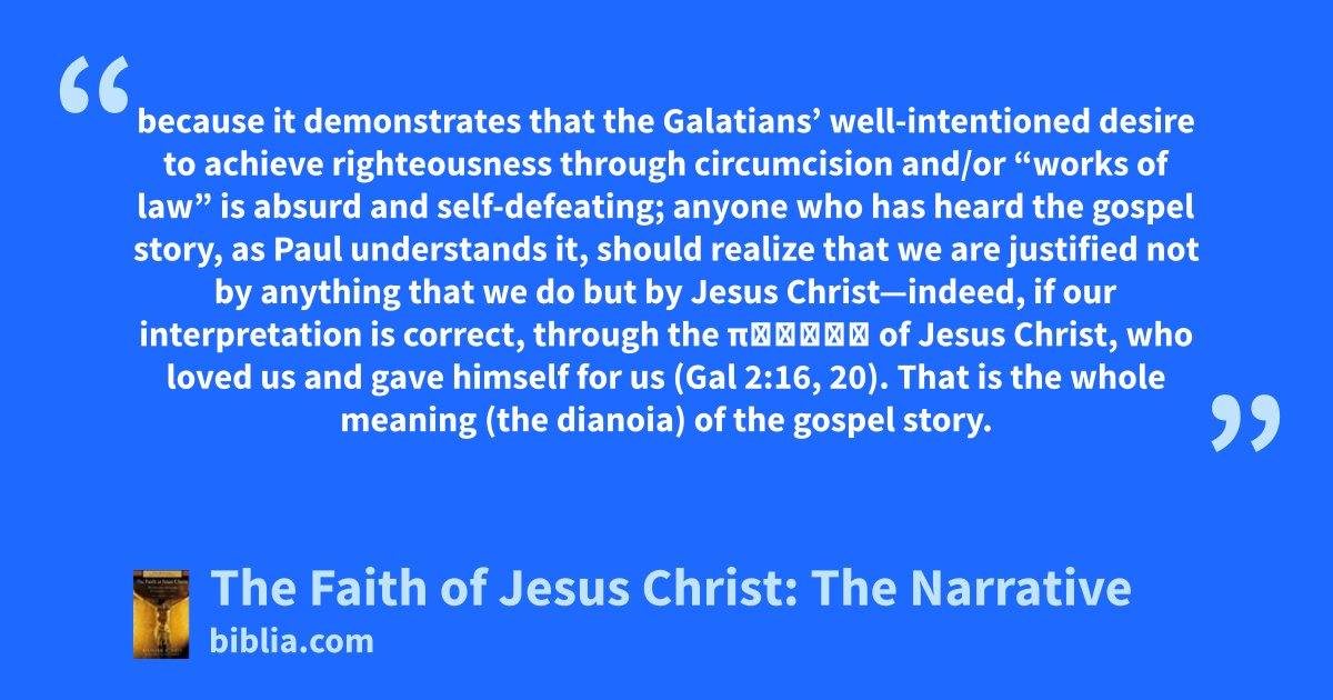 because it demonstrates that the Galatians’ well-intentioned desire to achieve righteousness through circumcision and/or “works of law” is absurd and self-defeating; anyone who has heard the gospel story, as Paul understands it, should realize that we are justified not by anything that we do but by Jesus Christ—indeed, if our interpretation is correct, through the πίστις of Jesus Christ, who loved us and gave himself for us (Gal 2:16, 20). That is the whole meaning (the dianoia) of the gospel story.