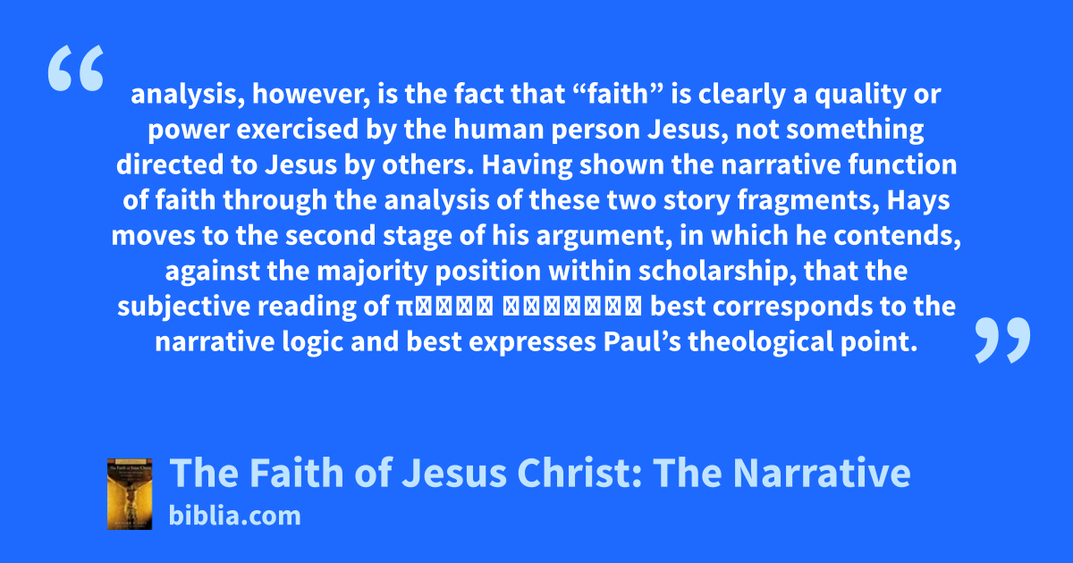 analysis, however, is the fact that “faith” is clearly a quality or power exercised by the human person Jesus, not something directed to Jesus by others. Having shown the narrative function of faith through the analysis of these two story fragments, Hays moves to the second stage of his argument, in which he contends, against the majority position within scholarship, that the subjective reading of πίσις Χριστοῦ best corresponds to the narrative logic and best expresses Paul’s theological point.