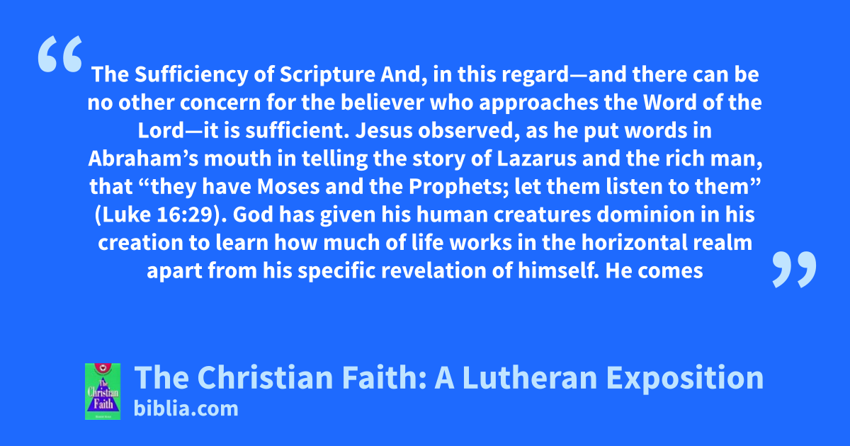 The Sufficiency of Scripture And, in this regard—and there can be no other concern for the believer who approaches the Word of the Lord—it is sufficient. Jesus observed, as he put words in Abraham’s mouth in telling the story of Lazarus and the rich man, that “they have Moses and the Prophets; let them listen to them” (Luke 16:29). God has given his human creatures dominion in his creation to learn how much of life works in the horizontal realm apart from his specific revelation of himself. He comes