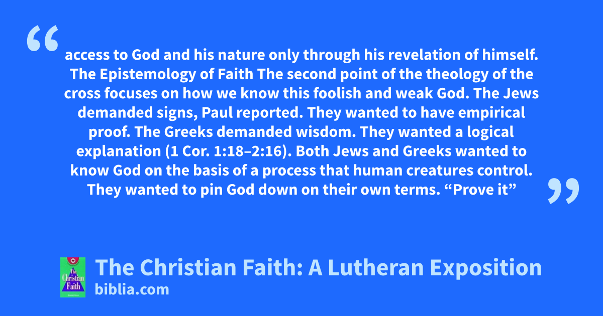 access to God and his nature only through his revelation of himself. The Epistemology of Faith The second point of the theology of the cross focuses on how we know this foolish and weak God. The Jews demanded signs, Paul reported. They wanted to have empirical proof. The Greeks demanded wisdom. They wanted a logical explanation (1 Cor. 1:18–2:16). Both Jews and Greeks wanted to know God on the basis of a process that human creatures control. They wanted to pin God down on their own terms. “Prove it”