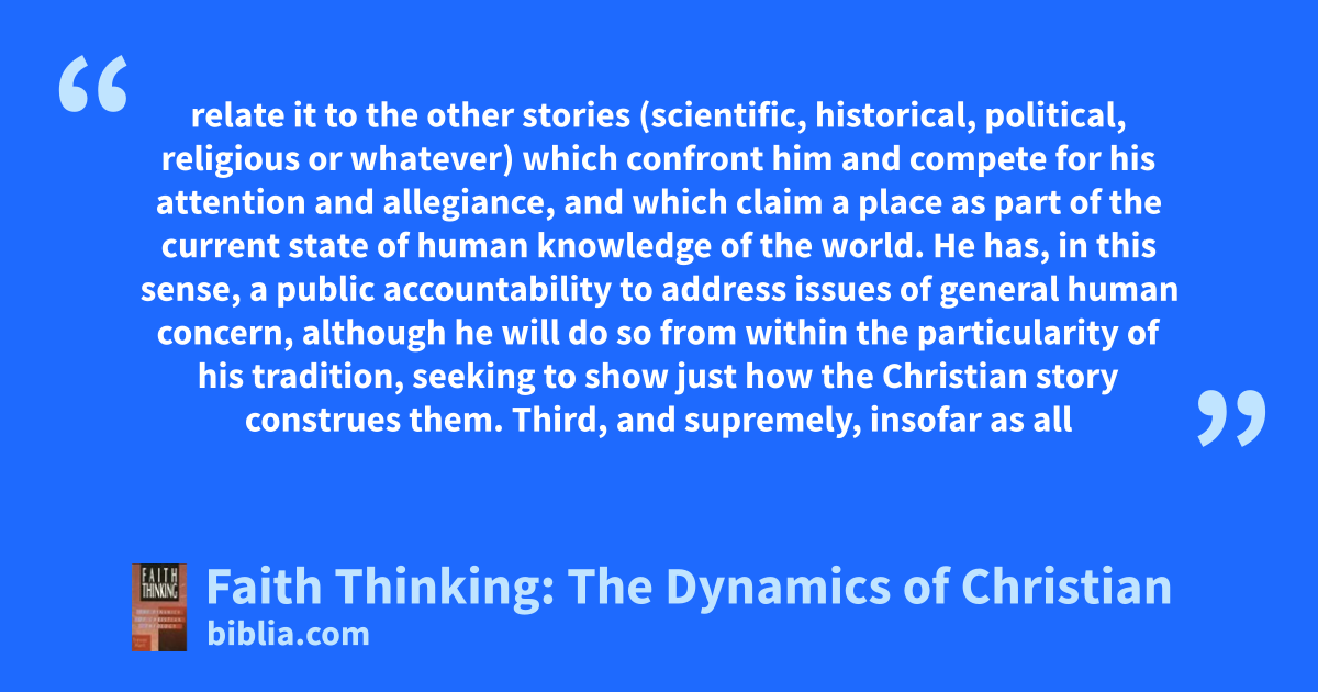 relate it to the other stories (scientific, historical, political, religious or whatever) which confront him and compete for his attention and allegiance, and which claim a place as part of the current state of human knowledge of the world. He has, in this sense, a public accountability to address issues of general human concern, although he will do so from within the particularity of his tradition, seeking to show just how the Christian story construes them. Third, and supremely, insofar as all