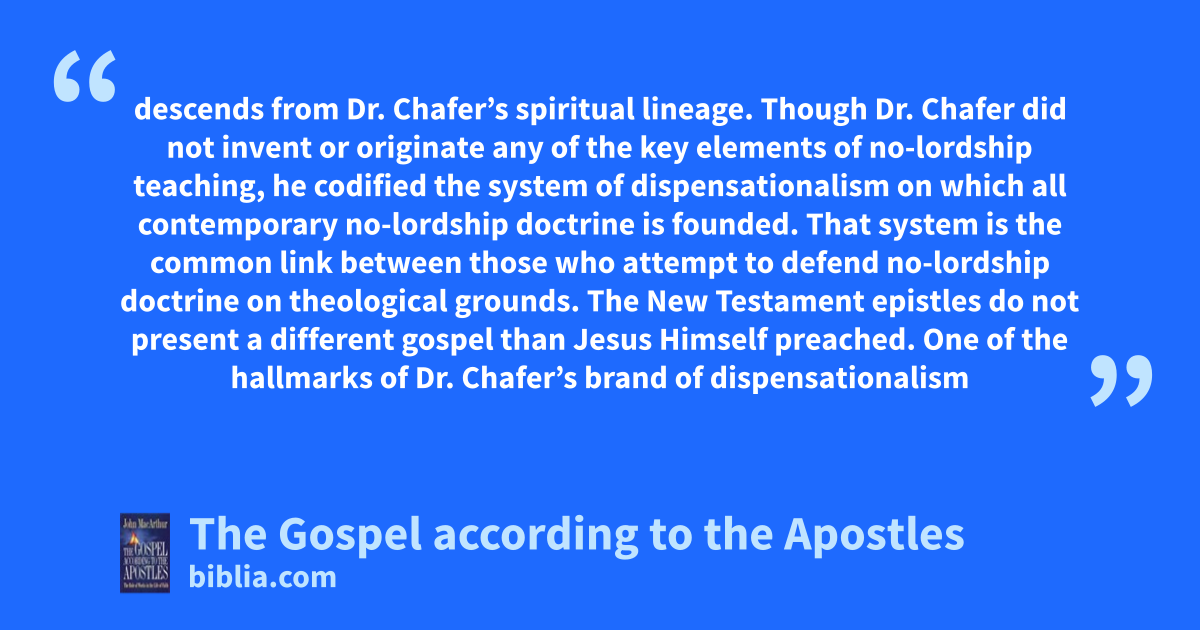 descends from Dr. Chafer’s spiritual lineage. Though Dr. Chafer did not invent or originate any of the key elements of no-lordship teaching, he codified the system of dispensationalism on which all contemporary no-lordship doctrine is founded. That system is the common link between those who attempt to defend no-lordship doctrine on theological grounds. The New Testament epistles do not present a different gospel than Jesus Himself preached. One of the hallmarks of Dr. Chafer’s brand of dispensationalism