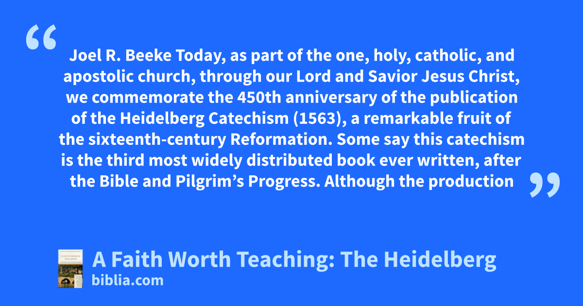 Joel R. Beeke Today, as part of the one, holy, catholic, and apostolic church, through our Lord and Savior Jesus Christ, we commemorate the 450th anniversary of the publication of the Heidelberg Catechism (1563), a remarkable fruit of the sixteenth-century Reformation. Some say this catechism is the third most widely distributed book ever written, after the Bible and Pilgrim’s Progress. Although the production