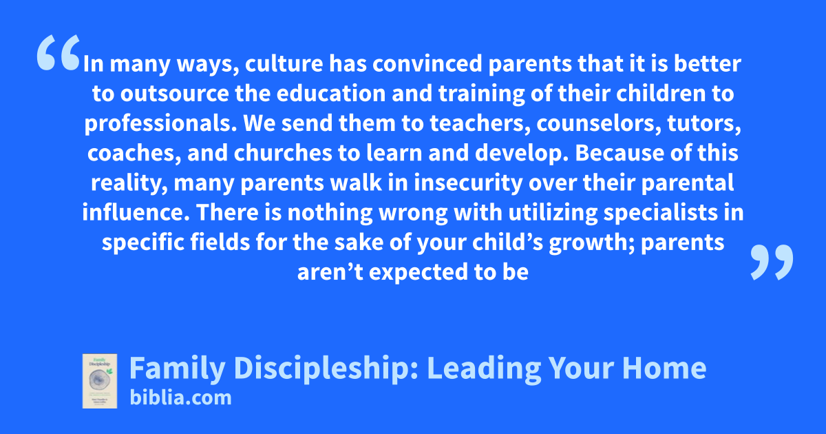 In many ways, culture has convinced parents that it is better to outsource the education and training of their children to professionals. We send them to teachers, counselors, tutors, coaches, and churches to learn and develop. Because of this reality, many parents walk in insecurity over their parental influence. There is nothing wrong with utilizing specialists in specific fields for the sake of your child’s growth; parents aren’t expected to be
