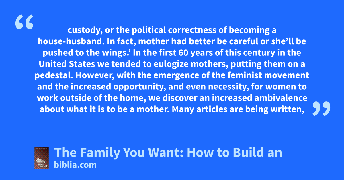 custody, or the political correctness of becoming a house-husband. In fact, mother had better be careful or she’ll be pushed to the wings.’ In the first 60 years of this century in the United States we tended to eulogize mothers, putting them on a pedestal. However, with the emergence of the feminist movement and the increased opportunity, and even necessity, for women to work outside of the home, we discover an increased ambivalence about what it is to be a mother. Many articles are being written,