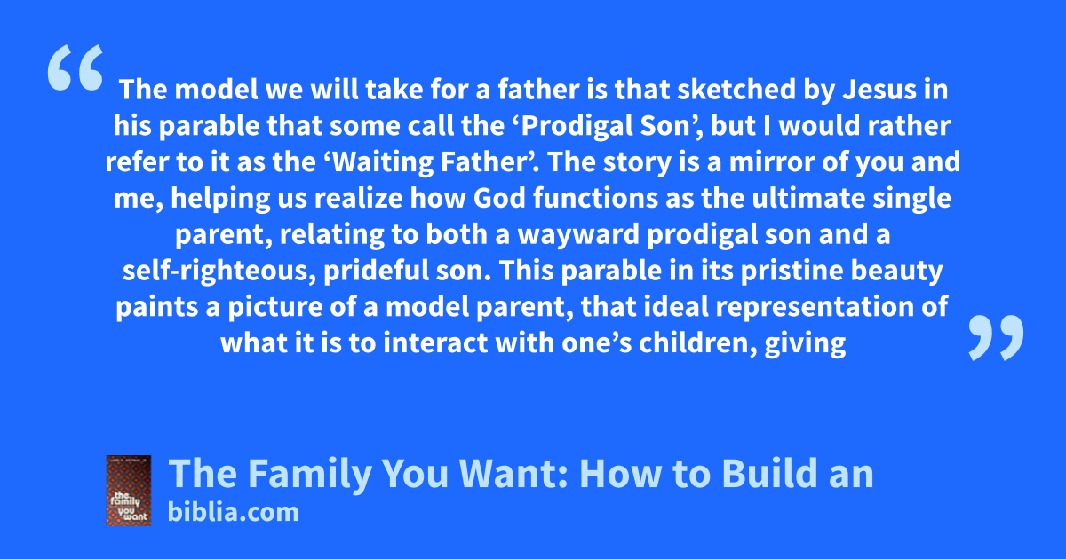 The model we will take for a father is that sketched by Jesus in his parable that some call the ‘Prodigal Son’, but I would rather refer to it as the ‘Waiting Father’. The story is a mirror of you and me, helping us realize how God functions as the ultimate single parent, relating to both a wayward prodigal son and a self-righteous, prideful son. This parable in its pristine beauty paints a picture of a model parent, that ideal representation of what it is to interact with one’s children, giving