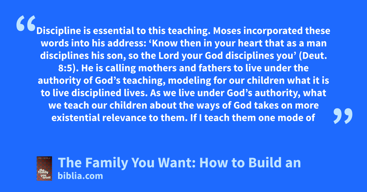 Discipline is essential to this teaching. Moses incorporated these words into his address: ‘Know then in your heart that as a man disciplines his son, so the Lord your God disciplines you’ (Deut. 8:5). He is calling mothers and fathers to live under the authority of God’s teaching, modeling for our children what it is to live disciplined lives. As we live under God’s authority, what we teach our children about the ways of God takes on more existential relevance to them. If I teach them one mode of