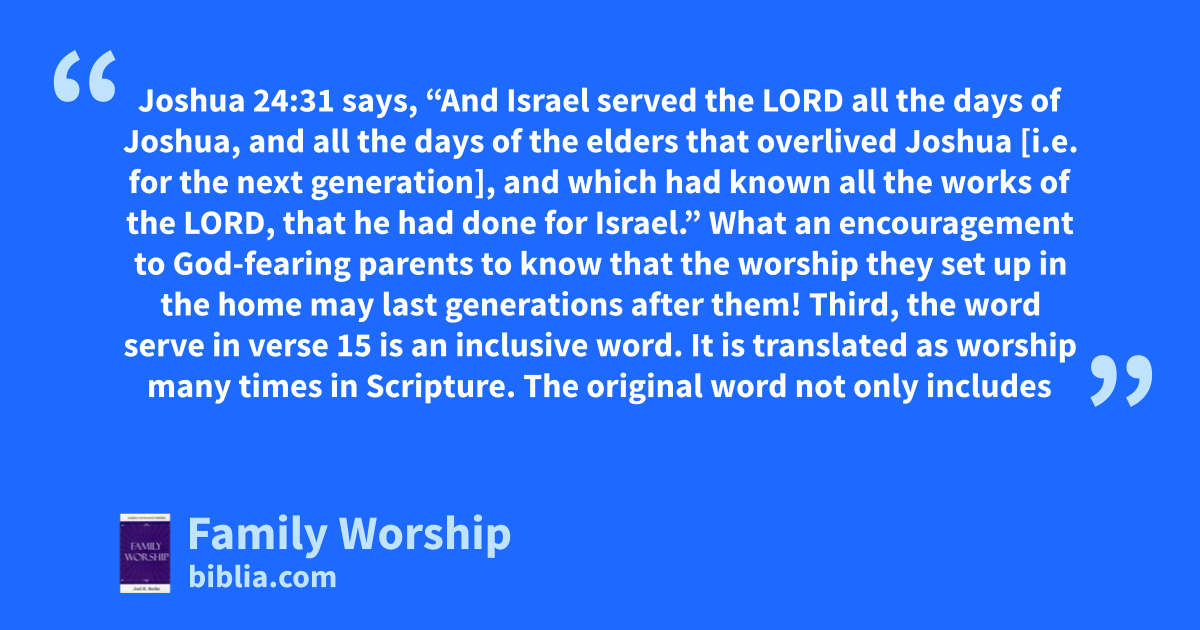 Joshua 24:31 says, “And Israel served the LORD all the days of Joshua, and all the days of the elders that overlived Joshua [i.e. for the next generation], and which had known all the works of the LORD, that he had done for Israel.” What an encouragement to God-fearing parents to know that the worship they set up in the home may last generations after them! Third, the word serve in verse 15 is an inclusive word. It is translated as worship many times in Scripture. The original word not only includes