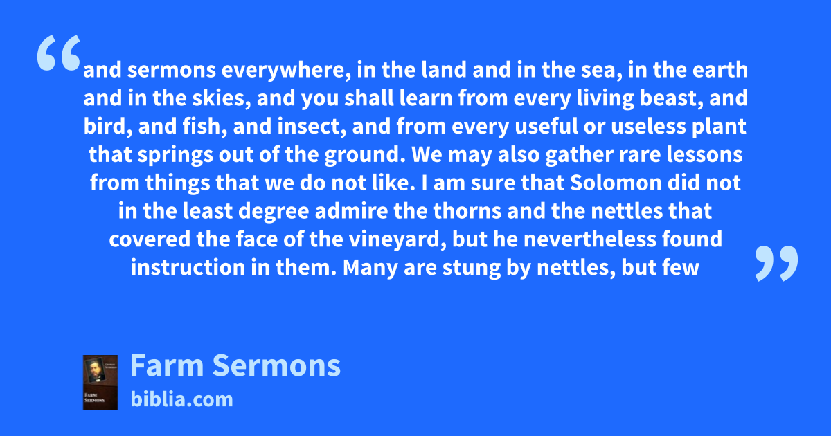 and sermons everywhere, in the land and in the sea, in the earth and in the skies, and you shall learn from every living beast, and bird, and fish, and insect, and from every useful or useless plant that springs out of the ground. We may also gather rare lessons from things that we do not like. I am sure that Solomon did not in the least degree admire the thorns and the nettles that covered the face of the vineyard, but he nevertheless found instruction in them. Many are stung by nettles, but few