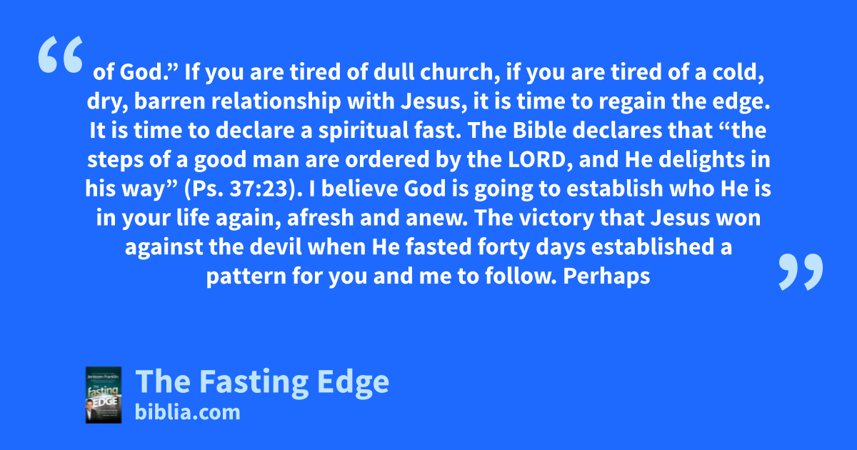 of God.” If you are tired of dull church, if you are tired of a cold, dry, barren relationship with Jesus, it is time to regain the edge. It is time to declare a spiritual fast. The Bible declares that “the steps of a good man are ordered by the LORD, and He delights in his way” (Ps. 37:23). I believe God is going to establish who He is in your life again, afresh and anew. The victory that Jesus won against the devil when He fasted forty days established a pattern for you and me to follow. Perhaps