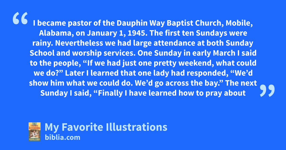 I became pastor of the Dauphin Way Baptist Church, Mobile, Alabama, on January 1, 1945. The first ten Sundays were rainy. Nevertheless we had large attendance at both Sunday School and worship services. One Sunday in early March I said to the people, “If we had just one pretty weekend, what could we do?” Later I learned that one lady had responded, “We’d show him what we could do. We’d go across the bay.” The next Sunday I said, “Finally I have learned how to pray about