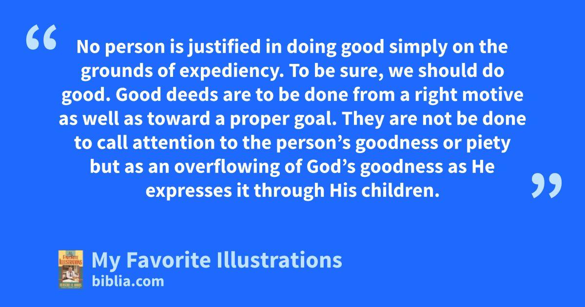 No person is justified in doing good simply on the grounds of expediency. To be sure, we should do good. Good deeds are to be done from a right motive as well as toward a proper goal. They are not be done to call attention to the person’s goodness or piety but as an overflowing of God’s goodness as He expresses it through His children.
