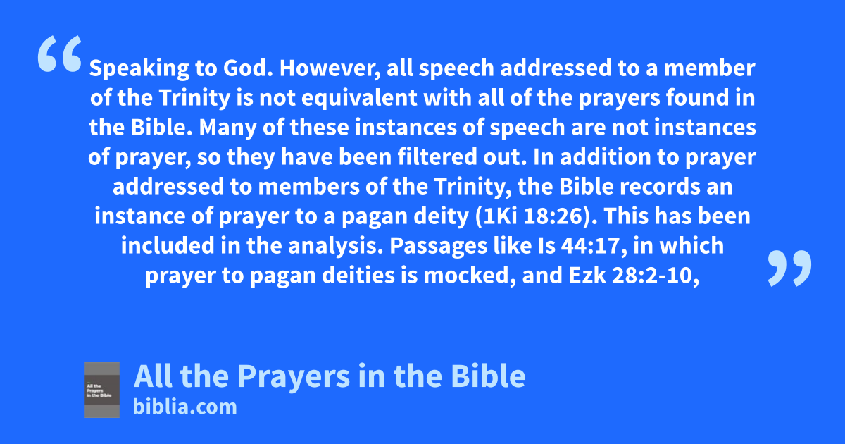 Speaking to God. However, all speech addressed to a member of the Trinity is not equivalent with all of the prayers found in the Bible. Many of these instances of speech are not instances of prayer, so they have been filtered out. In addition to prayer addressed to members of the Trinity, the Bible records an instance of prayer to a pagan deity (1Ki 18:26). This has been included in the analysis. Passages like Is 44:17, in which prayer to pagan deities is mocked, and Ezk 28:2-10,