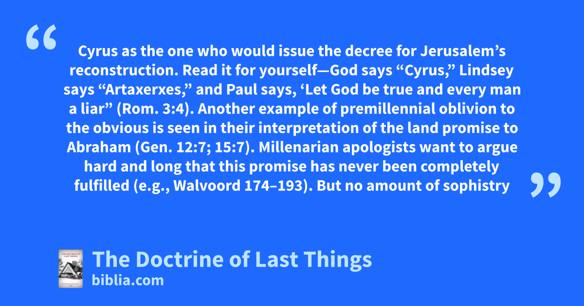 Cyrus as the one who would issue the decree for Jerusalem’s reconstruction. Read it for yourself—God says “Cyrus,” Lindsey says “Artaxerxes,” and Paul says, ‘Let God be true and every man a liar” (Rom. 3:4). Another example of premillennial oblivion to the obvious is seen in their interpretation of the land promise to Abraham (Gen. 12:7; 15:7). Millenarian apologists want to argue hard and long that this promise has never been completely fulfilled (e.g., Walvoord 174–193). But no amount of sophistry