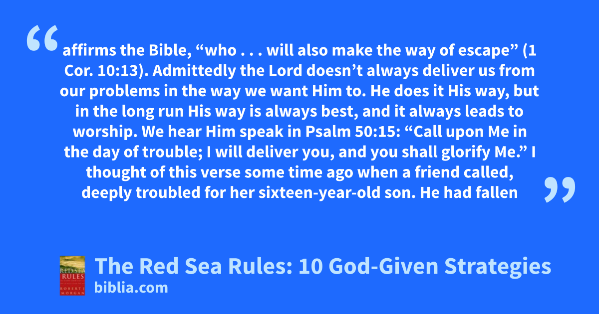 affirms the Bible, “who . . . will also make the way of escape” (1 Cor. 10:13). Admittedly the Lord doesn’t always deliver us from our problems in the way we want Him to. He does it His way, but in the long run His way is always best, and it always leads to worship. We hear Him speak in Psalm 50:15: “Call upon Me in the day of trouble; I will deliver you, and you shall glorify Me.” I thought of this verse some time ago when a friend called, deeply troubled for her sixteen-year-old son. He had fallen