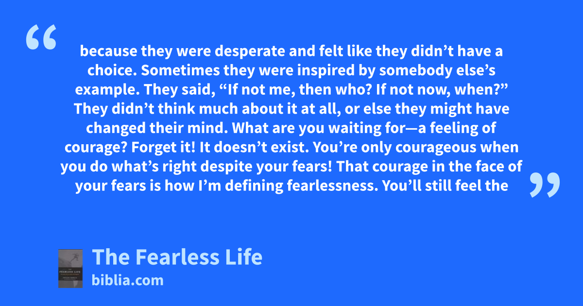 because they were desperate and felt like they didn’t have a choice. Sometimes they were inspired by somebody else’s example. They said, “If not me, then who? If not now, when?” They didn’t think much about it at all, or else they might have changed their mind. What are you waiting for—a feeling of courage? Forget it! It doesn’t exist. You’re only courageous when you do what’s right despite your fears! That courage in the face of your fears is how I’m defining fearlessness. You’ll still feel the