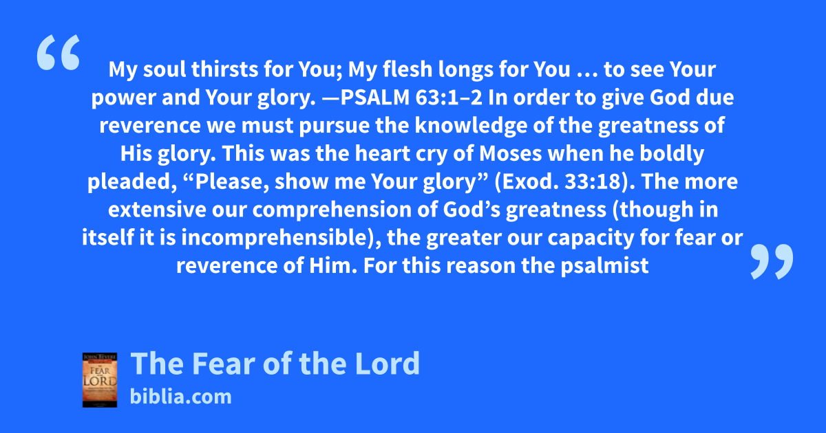 My soul thirsts for You; My flesh longs for You … to see Your power and Your glory. —PSALM 63:1–2 In order to give God due reverence we must pursue the knowledge of the greatness of His glory. This was the heart cry of Moses when he boldly pleaded, “Please, show me Your glory” (Exod. 33:18). The more extensive our comprehension of God’s greatness (though in itself it is incomprehensible), the greater our capacity for fear or reverence of Him. For this reason the psalmist