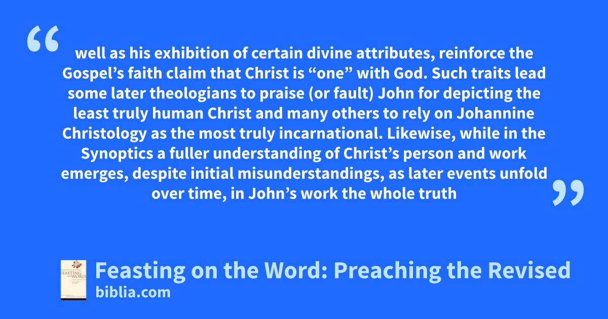 well as his exhibition of certain divine attributes, reinforce the Gospel’s faith claim that Christ is “one” with God. Such traits lead some later theologians to praise (or fault) John for depicting the least truly human Christ and many others to rely on Johannine Christology as the most truly incarnational. Likewise, while in the Synoptics a fuller understanding of Christ’s person and work emerges, despite initial misunderstandings, as later events unfold over time, in John’s work the whole truth
