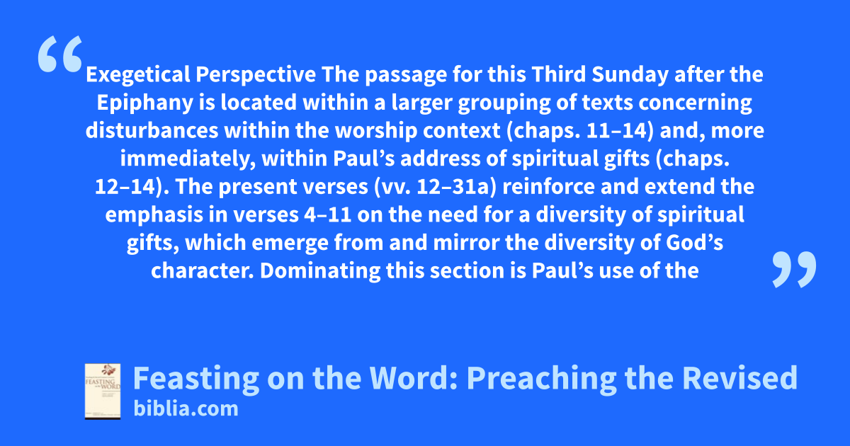 Exegetical Perspective The passage for this Third Sunday after the Epiphany is located within a larger grouping of texts concerning disturbances within the worship context (chaps. 11–14) and, more immediately, within Paul’s address of spiritual gifts (chaps. 12–14). The present verses (vv. 12–31a) reinforce and extend the emphasis in verses 4–11 on the need for a diversity of spiritual gifts, which emerge from and mirror the diversity of God’s character. Dominating this section is Paul’s use of the