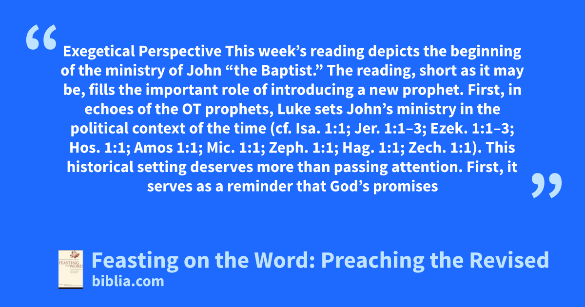 Exegetical Perspective This week’s reading depicts the beginning of the ministry of John “the Baptist.” The reading, short as it may be, fills the important role of introducing a new prophet. First, in echoes of the OT prophets, Luke sets John’s ministry in the political context of the time (cf. Isa. 1:1; Jer. 1:1–3; Ezek. 1:1–3; Hos. 1:1; Amos 1:1; Mic. 1:1; Zeph. 1:1; Hag. 1:1; Zech. 1:1). This historical setting deserves more than passing attention. First, it serves as a reminder that God’s promises