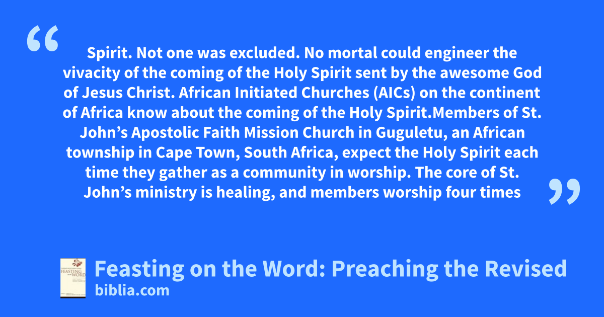 Spirit. Not one was excluded. No mortal could engineer the vivacity of the coming of the Holy Spirit sent by the awesome God of Jesus Christ. African Initiated Churches (AICs) on the continent of Africa know about the coming of the Holy Spirit.Members of St. John’s Apostolic Faith Mission Church in Guguletu, an African township in Cape Town, South Africa, expect the Holy Spirit each time they gather as a community in worship. The core of St. John’s ministry is healing, and members worship four times