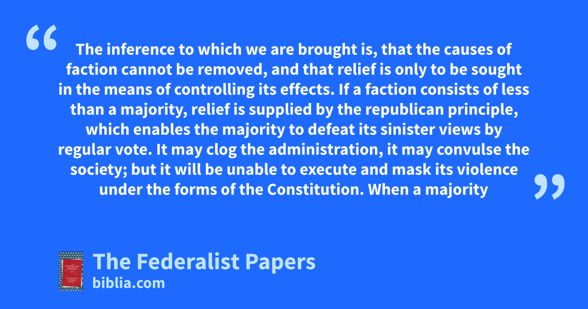 The inference to which we are brought is, that the causes of faction cannot be removed, and that relief is only to be sought in the means of controlling its effects. If a faction consists of less than a majority, relief is supplied by the republican principle, which enables the majority to defeat its sinister views by regular vote. It may clog the administration, it may convulse the society; but it will be unable to execute and mask its violence under the forms of the Constitution. When a majority