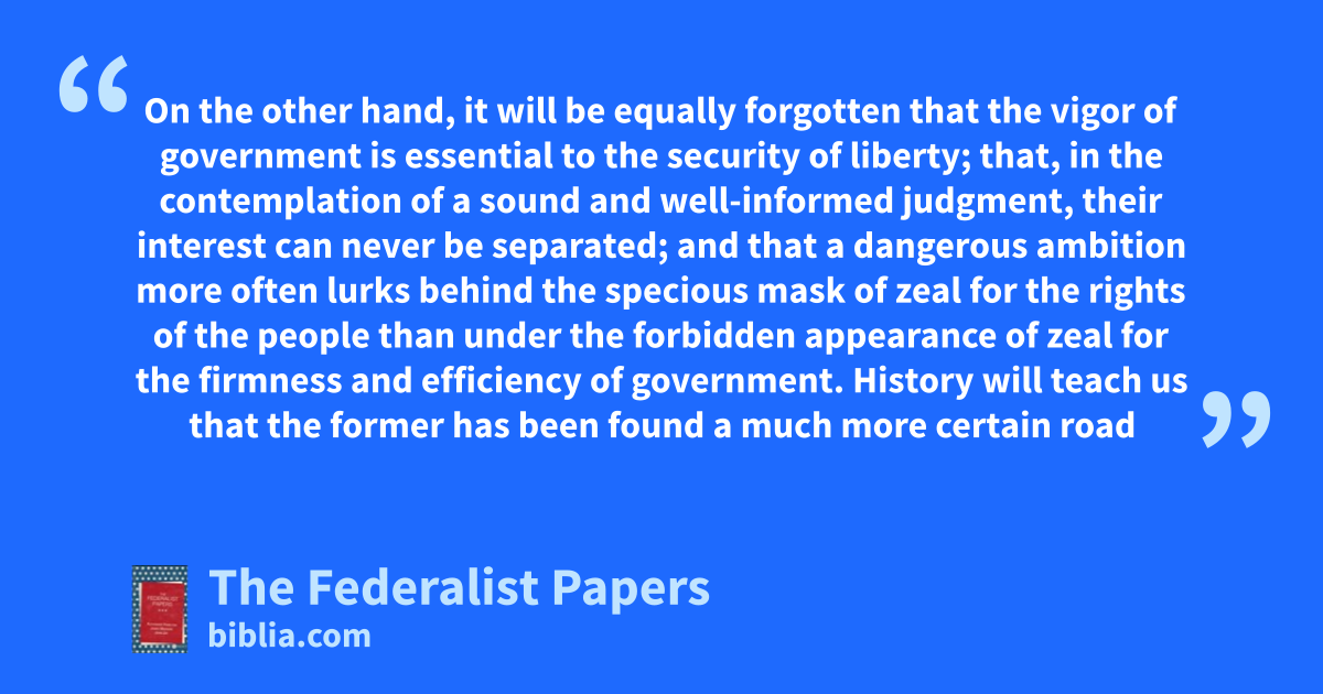 On the other hand, it will be equally forgotten that the vigor of government is essential to the security of liberty; that, in the contemplation of a sound and well-informed judgment, their interest can never be separated; and that a dangerous ambition more often lurks behind the specious mask of zeal for the rights of the people than under the forbidden appearance of zeal for the firmness and efficiency of government. History will teach us that the former has been found a much more certain road
