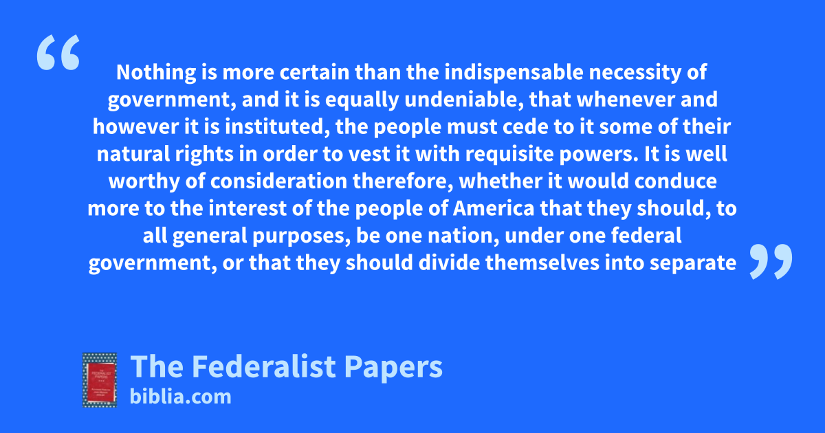 Nothing is more certain than the indispensable necessity of government, and it is equally undeniable, that whenever and however it is instituted, the people must cede to it some of their natural rights in order to vest it with requisite powers. It is well worthy of consideration therefore, whether it would conduce more to the interest of the people of America that they should, to all general purposes, be one nation, under one federal government, or that they should divide themselves into separate