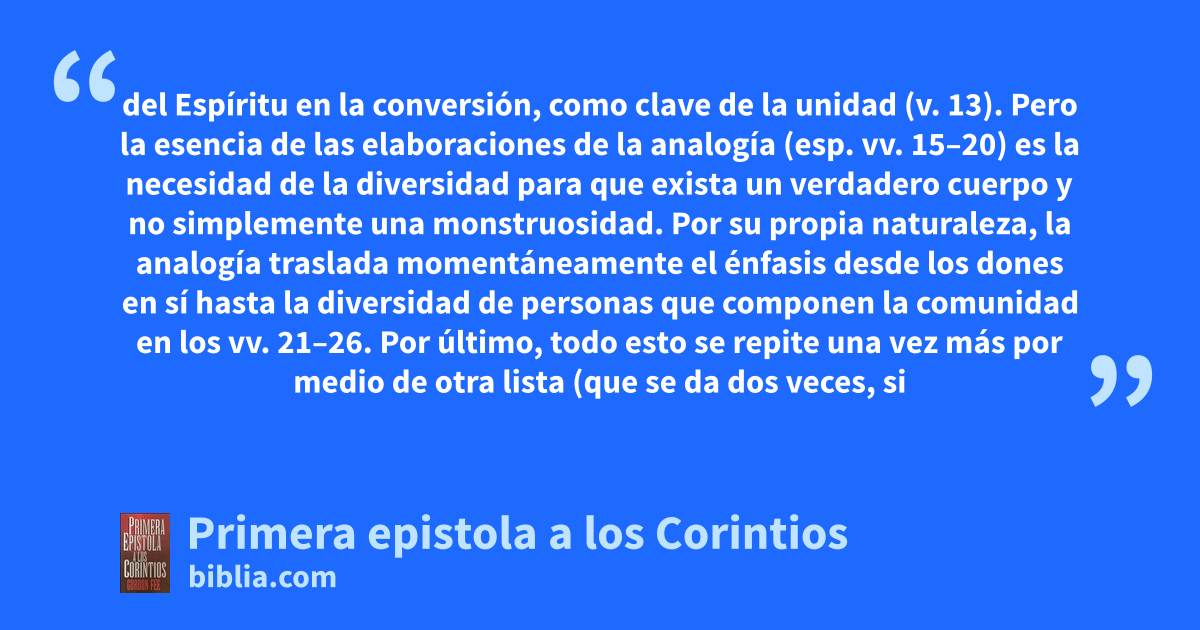 del Espíritu en la conversión, como clave de la unidad (v. 13). Pero la esencia de las elaboraciones de la analogía (esp. vv. 15–20) es la necesidad de la diversidad para que exista un verdadero cuerpo y no simplemente una monstruosidad. Por su propia naturaleza, la analogía traslada momentáneamente el énfasis desde los dones en sí hasta la diversidad de personas que componen la comunidad en los vv. 21–26. Por último, todo esto se repite una vez más por medio de otra lista (que se da dos veces, si