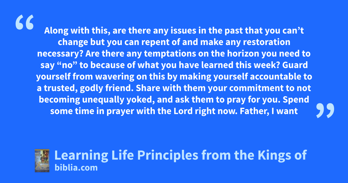 Along with this, are there any issues in the past that you can’t change but you can repent of and make any restoration necessary? Are there any temptations on the horizon you need to say “no” to because of what you have learned this week? Guard yourself from wavering on this by making yourself accountable to a trusted, godly friend. Share with them your commitment to not becoming unequally yoked, and ask them to pray for you. Spend some time in prayer with the Lord right now. Father, I want
