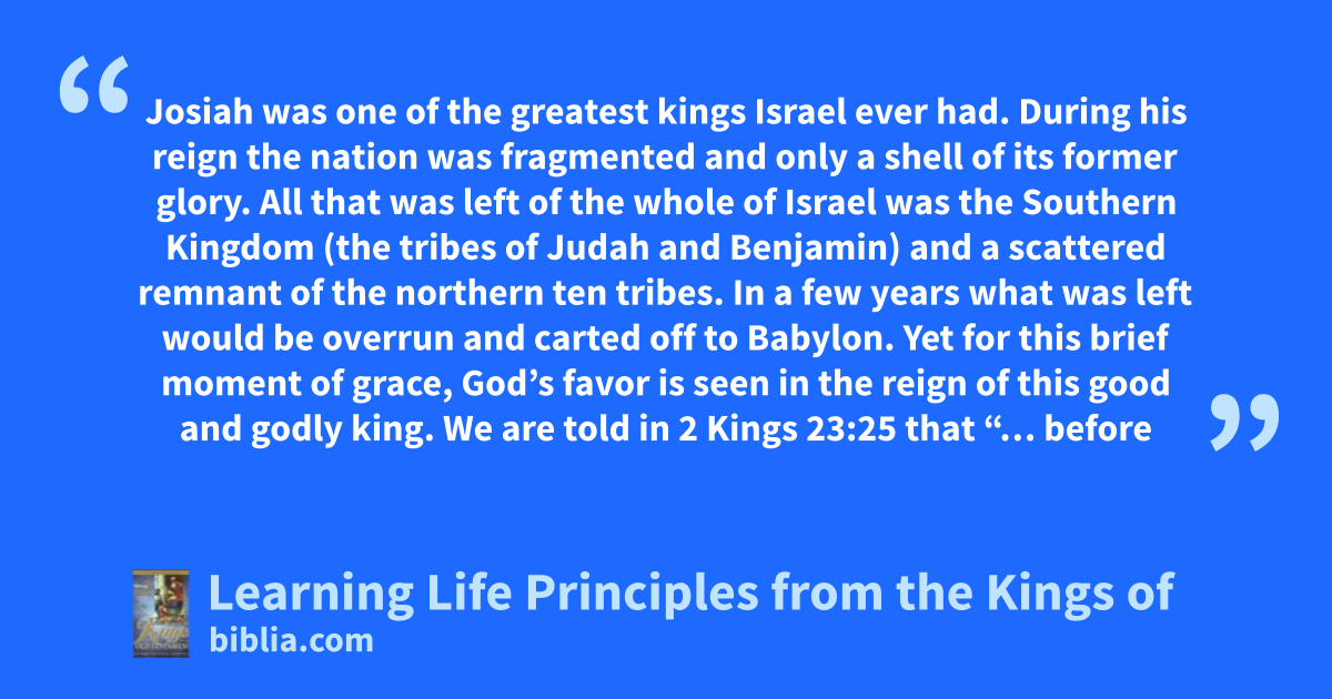 Josiah was one of the greatest kings Israel ever had. During his reign the nation was fragmented and only a shell of its former glory. All that was left of the whole of Israel was the Southern Kingdom (the tribes of Judah and Benjamin) and a scattered remnant of the northern ten tribes. In a few years what was left would be overrun and carted off to Babylon. Yet for this brief moment of grace, God’s favor is seen in the reign of this good and godly king. We are told in 2 Kings 23:25 that “… before