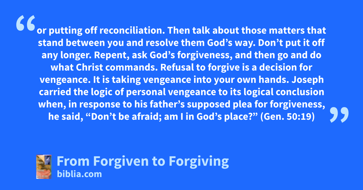 or putting off reconciliation. Then talk about those matters that stand between you and resolve them God’s way. Don’t put it off any longer. Repent, ask God’s forgiveness, and then go and do what Christ commands. Refusal to forgive is a decision for vengeance. It is taking vengeance into your own hands. Joseph carried the logic of personal vengeance to its logical conclusion when, in response to his father’s supposed plea for forgiveness, he said, “Don’t be afraid; am I in God’s place?” (Gen. 50:19)