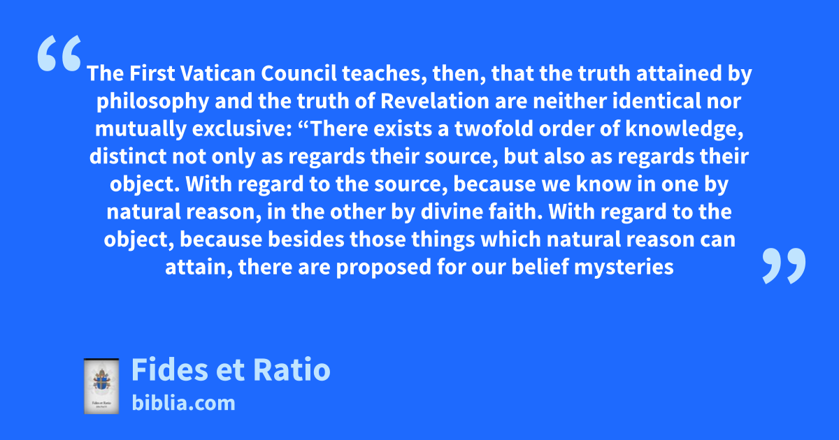 The First Vatican Council teaches, then, that the truth attained by philosophy and the truth of Revelation are neither identical nor mutually exclusive: “There exists a twofold order of knowledge, distinct not only as regards their source, but also as regards their object. With regard to the source, because we know in one by natural reason, in the other by divine faith. With regard to the object, because besides those things which natural reason can attain, there are proposed for our belief mysteries