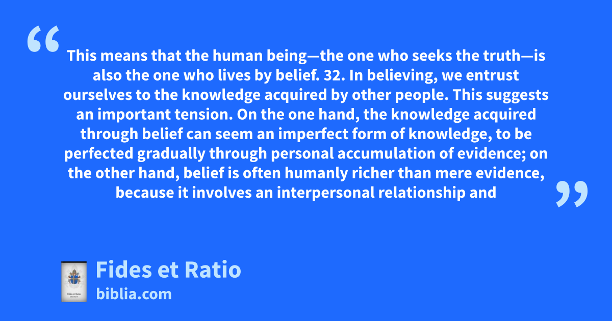 This means that the human being—the one who seeks the truth—is also the one who lives by belief. 32. In believing, we entrust ourselves to the knowledge acquired by other people. This suggests an important tension. On the one hand, the knowledge acquired through belief can seem an imperfect form of knowledge, to be perfected gradually through personal accumulation of evidence; on the other hand, belief is often humanly richer than mere evidence, because it involves an interpersonal relationship and