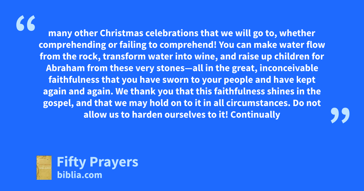many other Christmas celebrations that we will go to, whether comprehending or failing to comprehend! You can make water flow from the rock, transform water into wine, and raise up children for Abraham from these very stones—all in the great, inconceivable faithfulness that you have sworn to your people and have kept again and again. We thank you that this faithfulness shines in the gospel, and that we may hold on to it in all circumstances. Do not allow us to harden ourselves to it! Continually
