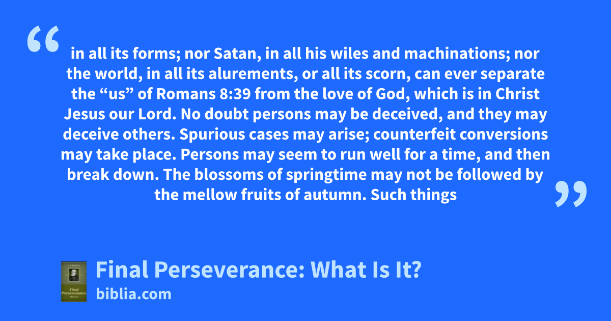 in all its forms; nor Satan, in all his wiles and machinations; nor the world, in all its alurements, or all its scorn, can ever separate the “us” of Romans 8:39 from the love of God, which is in Christ Jesus our Lord. No doubt persons may be deceived, and they may deceive others. Spurious cases may arise; counterfeit conversions may take place. Persons may seem to run well for a time, and then break down. The blossoms of springtime may not be followed by the mellow fruits of autumn. Such things