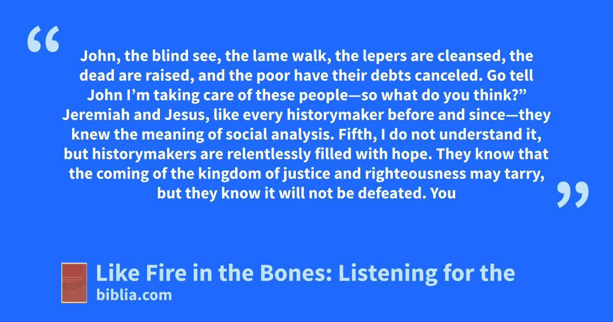 John, the blind see, the lame walk, the lepers are cleansed, the dead are raised, and the poor have their debts canceled. Go tell John I’m taking care of these people—so what do you think?” Jeremiah and Jesus, like every historymaker before and since—they knew the meaning of social analysis. Fifth, I do not understand it, but historymakers are relentlessly filled with hope. They know that the coming of the kingdom of justice and righteousness may tarry, but they know it will not be defeated. You
