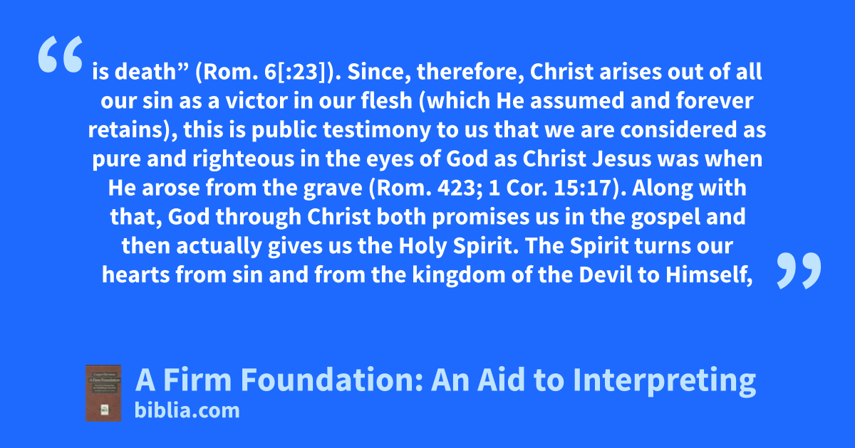 is death” (Rom. 6[:23]). Since, therefore, Christ arises out of all our sin as a victor in our flesh (which He assumed and forever retains), this is public testimony to us that we are considered as pure and righteous in the eyes of God as Christ Jesus was when He arose from the grave (Rom. 423; 1 Cor. 15:17). Along with that, God through Christ both promises us in the gospel and then actually gives us the Holy Spirit. The Spirit turns our hearts from sin and from the kingdom of the Devil to Himself,