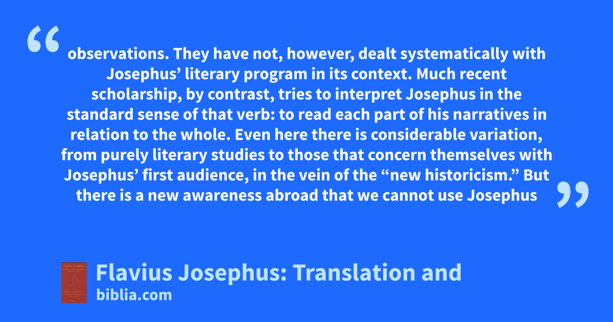 observations. They have not, however, dealt systematically with Josephus’ literary program in its context. Much recent scholarship, by contrast, tries to interpret Josephus in the standard sense of that verb: to read each part of his narratives in relation to the whole. Even here there is considerable variation, from purely literary studies to those that concern themselves with Josephus’ first audience, in the vein of the “new historicism.” But there is a new awareness abroad that we cannot use Josephus
