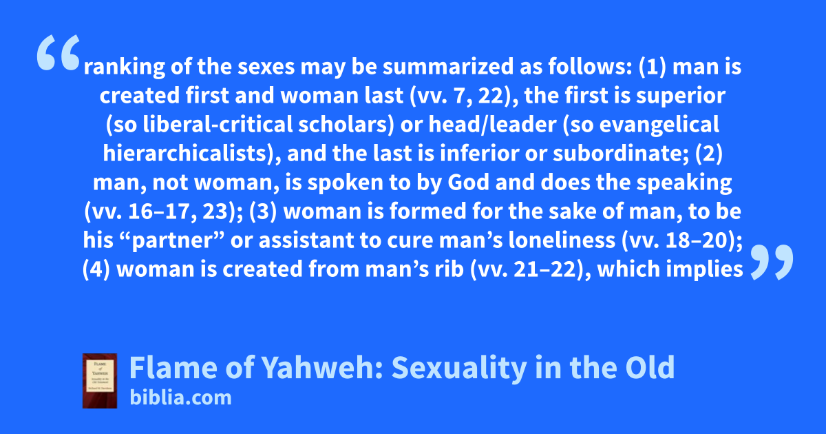 ranking of the sexes may be summarized as follows: (1) man is created first and woman last (vv. 7, 22), the first is superior (so liberal-critical scholars) or head/leader (so evangelical hierarchicalists), and the last is inferior or subordinate; (2) man, not woman, is spoken to by God and does the speaking (vv. 16–17, 23); (3) woman is formed for the sake of man, to be his “partner” or assistant to cure man’s loneliness (vv. 18–20); (4) woman is created from man’s rib (vv. 21–22), which implies