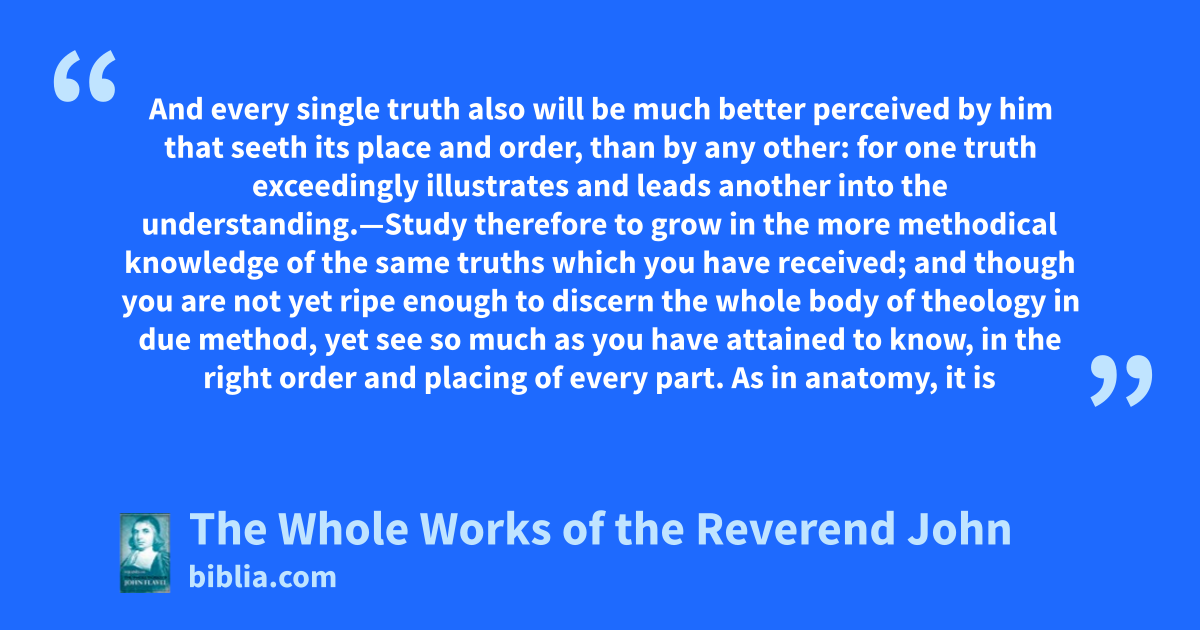 And every single truth also will be much better perceived by him that seeth its place and order, than by any other: for one truth exceedingly illustrates and leads another into the understanding.—Study therefore to grow in the more methodical knowledge of the same truths which you have received; and though you are not yet ripe enough to discern the whole body of theology in due method, yet see so much as you have attained to know, in the right order and placing of every part. As in anatomy, it is